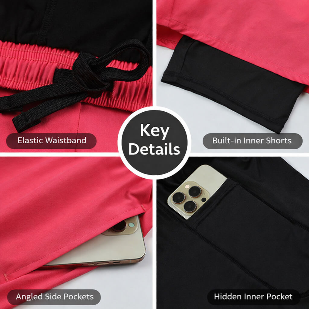 The slightly stretchy fabric and side slit design allow greater freedom of movement. These 2-in-1 workout shorts are perfect for running, gym training, fitness, cycling, hiking, and everyday sports activities.